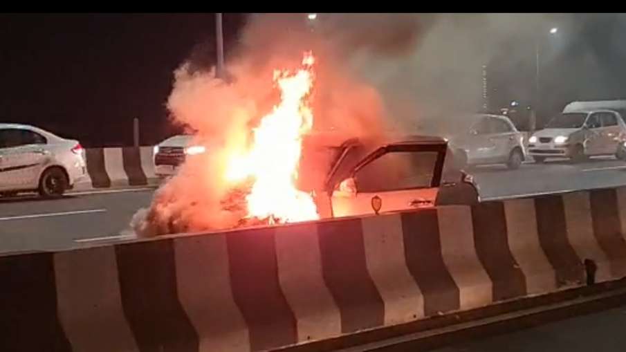 गाजियाबाद में हाईवे पर आग का गोला बनी कार, पैसेंजर्स ने गाड़ी से कूदकर बचाई जान